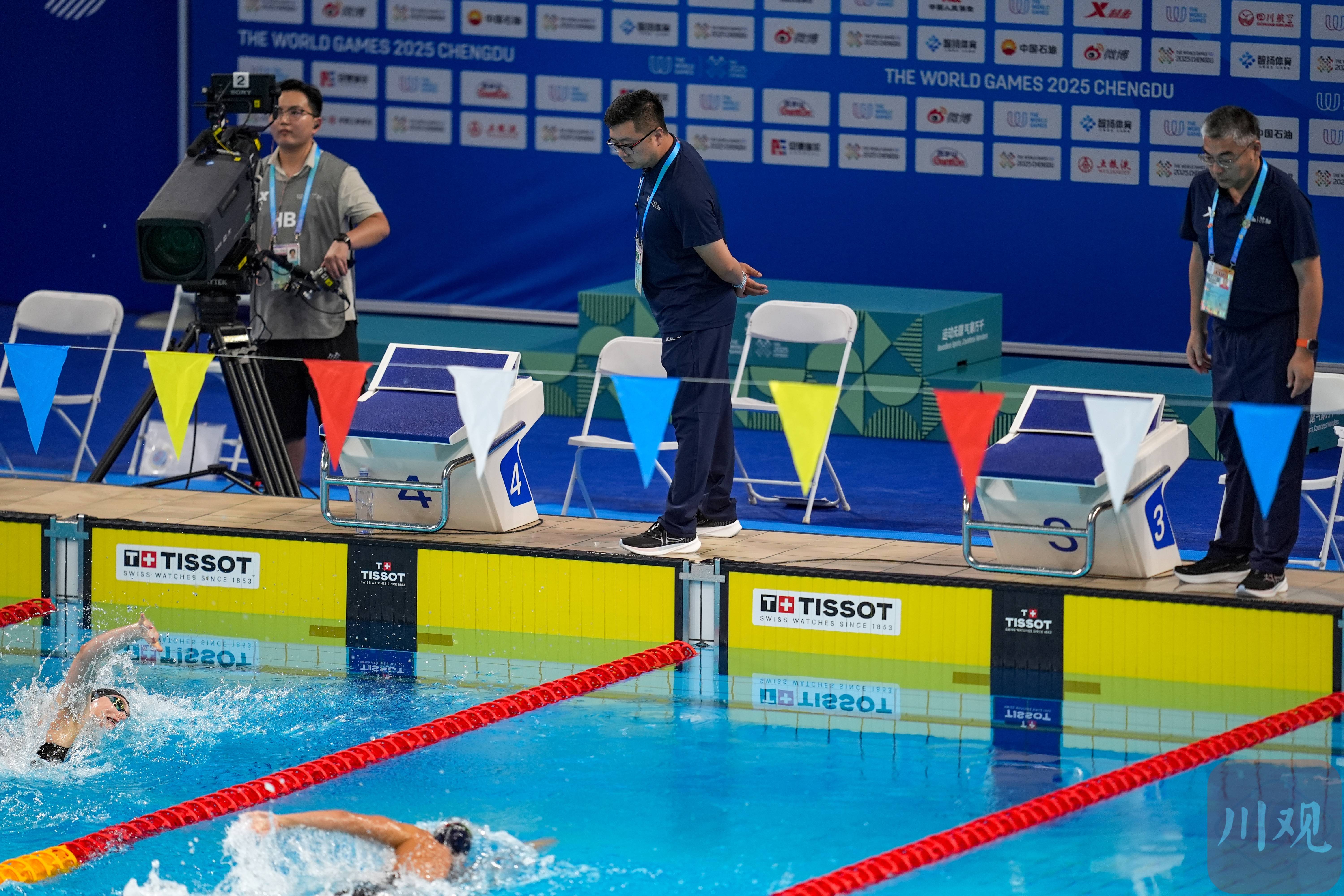 早在开赛前夕,8月6日记者探访演练现场时,便能感受到赛事筹备的严谨与细致。由中外裁判精英组成的联合裁判团队正在进行最后的磨合。他们并肩而坐,目光紧紧锁定水面,反复核对规则细节,模拟各种突发判罚场景。每一次发令枪响,裁判们便迅速追踪运动员入水、拖带假人,力求判罚精准到毫秒。