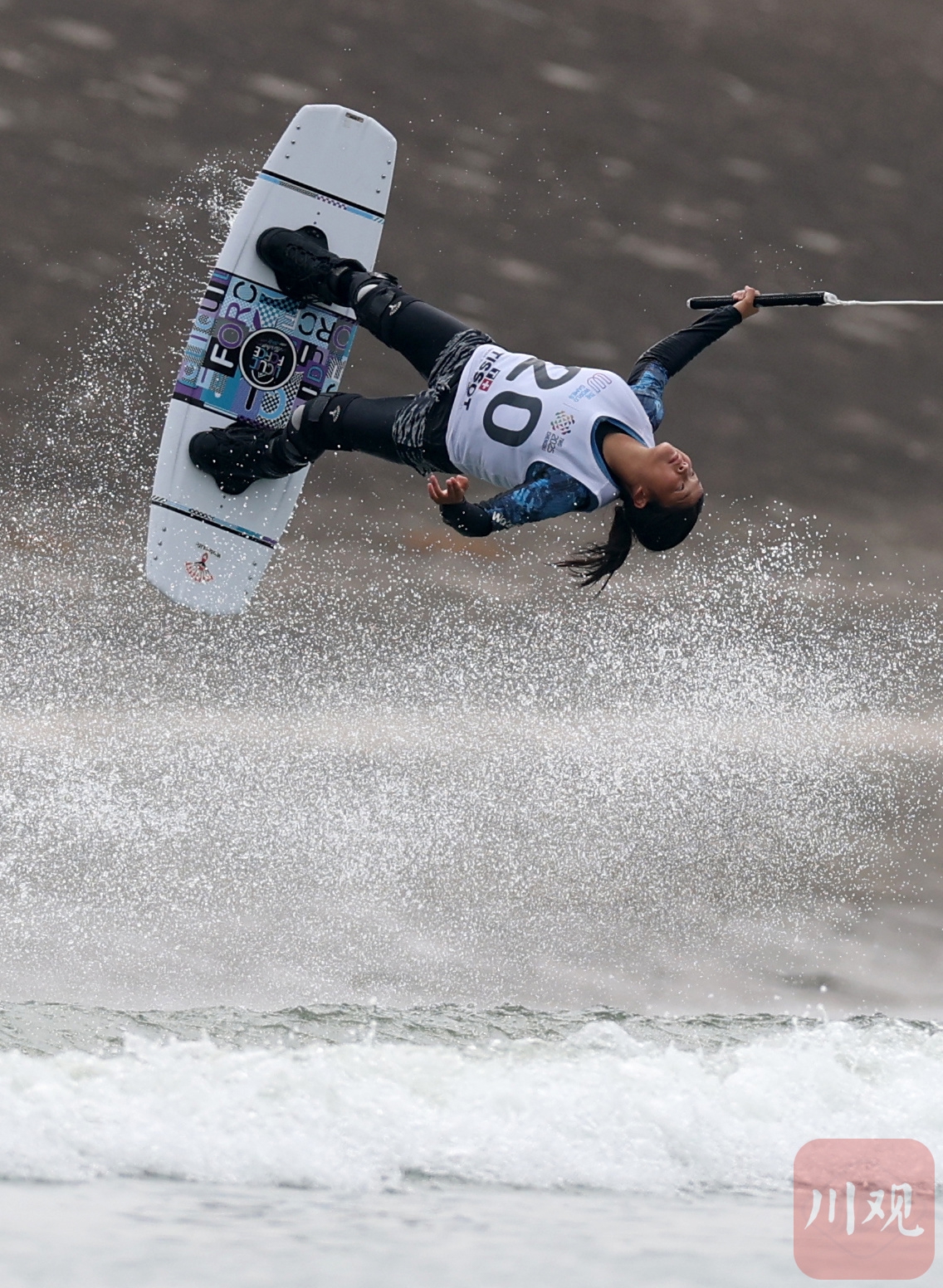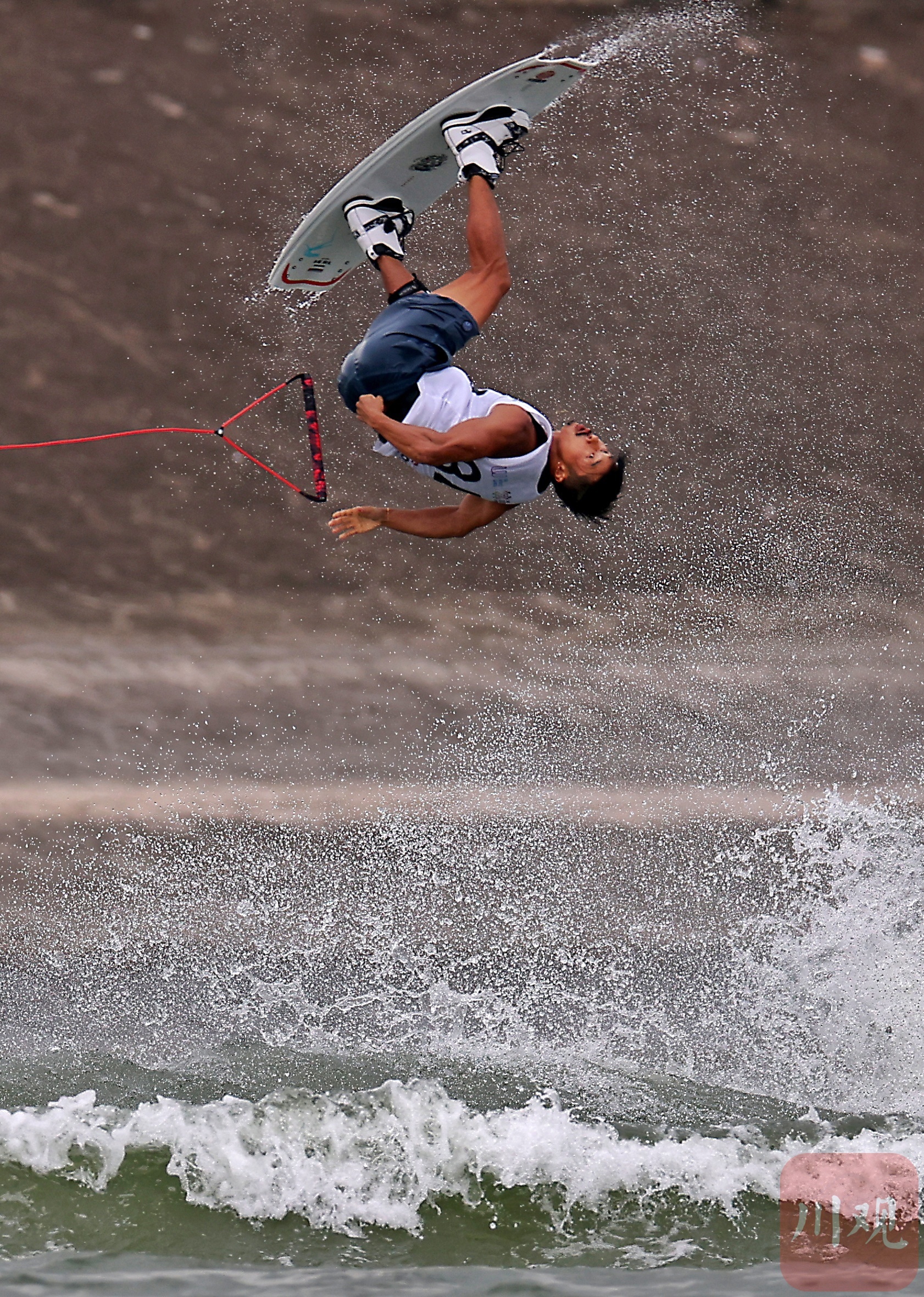 中国运动员在滑水项目中,空中意外脱手瞬间。