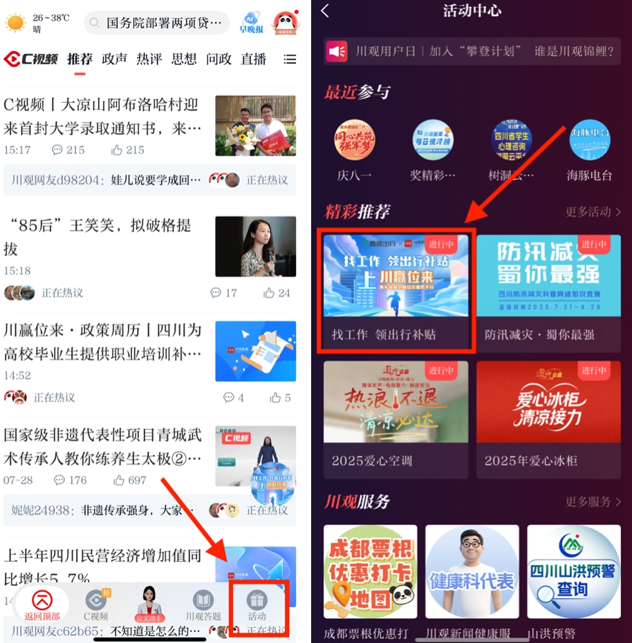 方式二:在川观新闻首页,点击右下角“活动”,进入到“活动中心”,找到“找工作 领出行补贴”活动图片点击参与。
