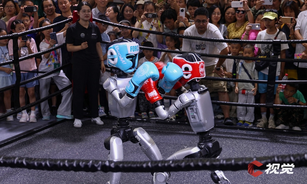 宇树科技G1格斗机器人进行拳击格斗赛,吸引众多观众加油助威。