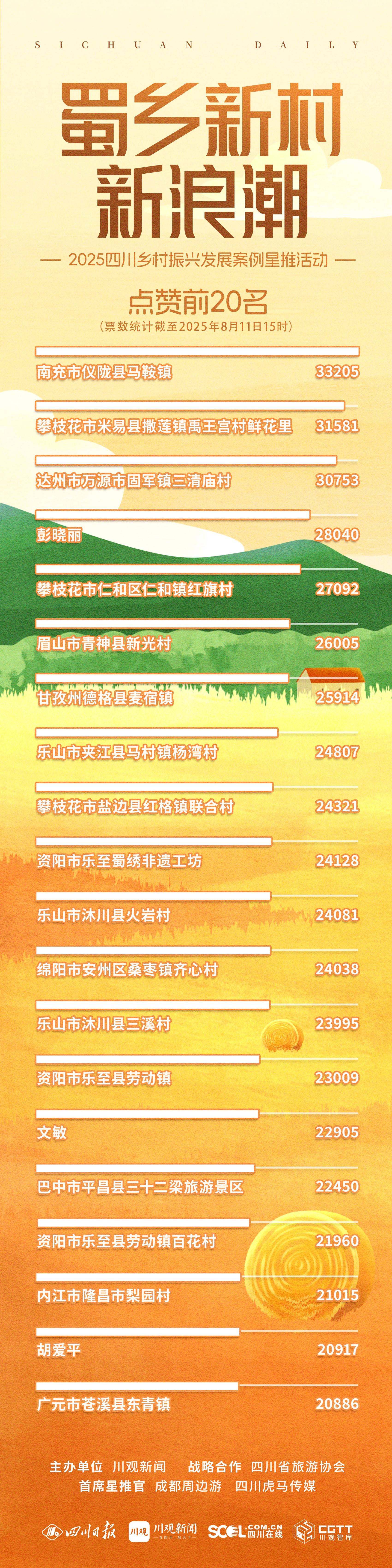 截至8月11日15时,南充市仪陇县马鞍镇、攀枝花市米易县撒莲镇禹王宫村鲜花里、达州市万源市固军镇三清庙村、彭晓丽、攀枝花市仁和区仁和镇红旗村暂时位列前五。当前榜单竞争非常激烈,名次随时可能发生变化,快来为你的家乡助力吧!