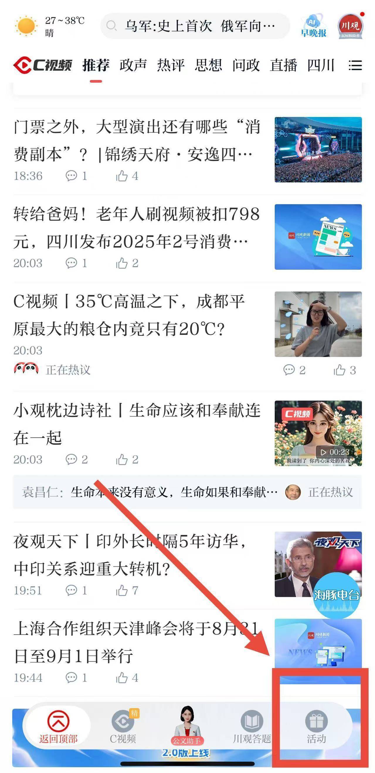 方式二:在川观新闻首页,点击右下角“活动”,进入“活动中心”,点击“更多活动”找到“蜀乡新村新浪潮”互动活动图片,点击进入。