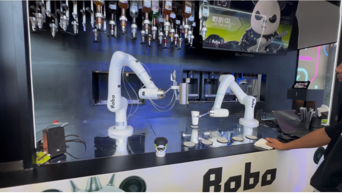 经过几轮排队,记者终于进入了“机器人大世界2.0”,映入眼帘的便是机器人主题餐厅“机器人焰究所”。在餐厅的一侧,一个全场景软饮吧被完整复刻了进来,里面有咖啡机器人、冷饮机器人、鸡尾酒机器人等机器人,还有精通七国语言的机器人酒保和你打招呼。