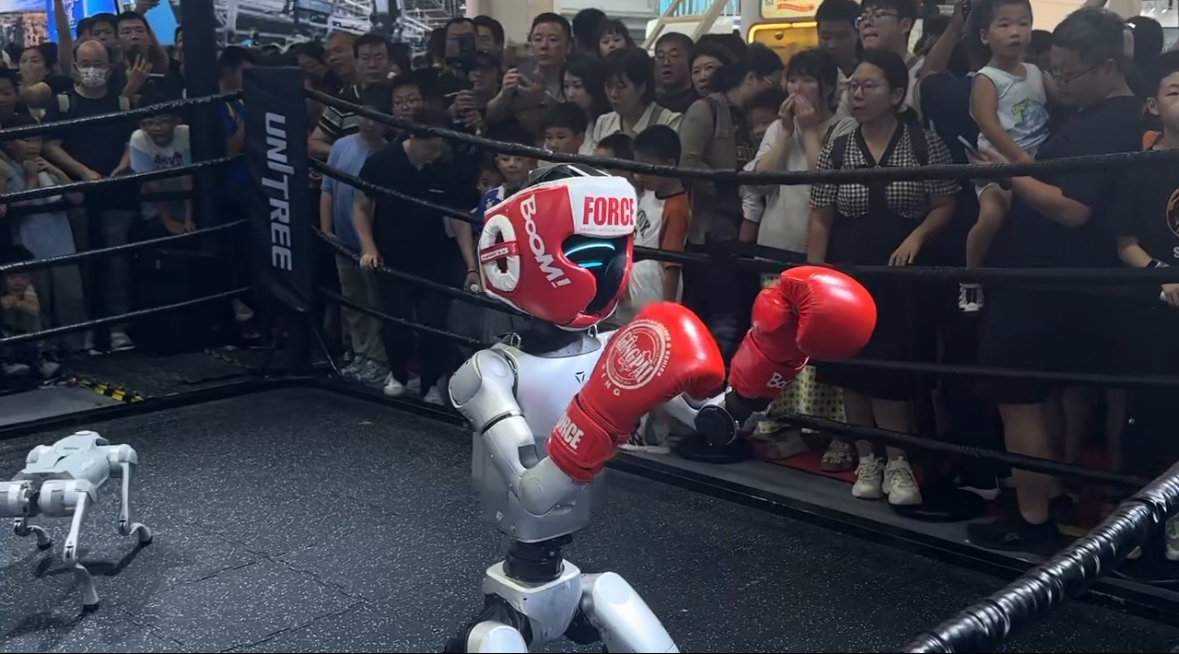 “在长达数分钟的激烈对抗中,机器人需要感知对手的动作,做出反应,无论是挥拳、踢腿还是闪避,都考验着动态平衡算法、运动控制精度和全身协同能力。”宇树科技工作人员告诉记者,机器人在格斗场上展现的运动控制能力,有利于机器人进入复杂、混乱的真实工业环境。