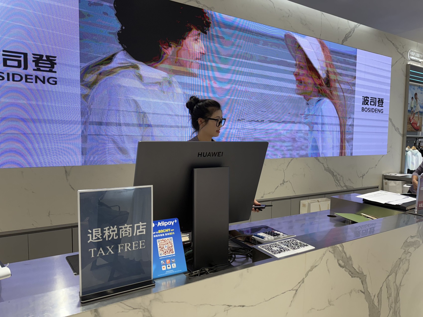 在记者采访的过程中,就遇到一位印尼游客来店里选购产品,她购买了价值6283元的冲锋衣和防晒服,领到退税金约565元,“我想继续买点小东西作为伴手礼。”