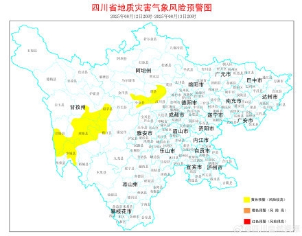 根据四川省气象台天气预报情况,结合四川省地质环境条件,8月12日20时至8月13日20时,全省地质灾害气象风险预警结果如下: