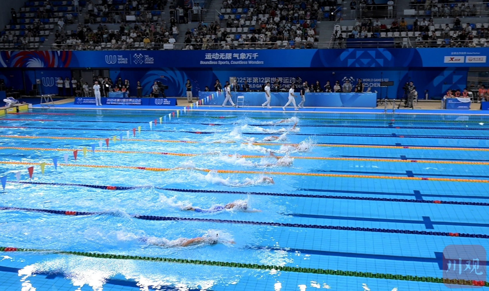 馆内灯光熄灭,水面恢复平静。8月11日晚,成都世运会成都体育学院游泳馆完成全部比赛项目。