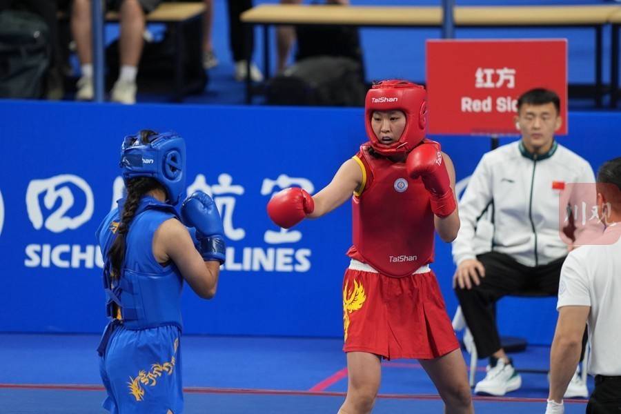 8月12日,中国选手陈梦粤在武术女子散打52公斤级决赛中以大比分2∶0战胜印度选手夺得金牌。