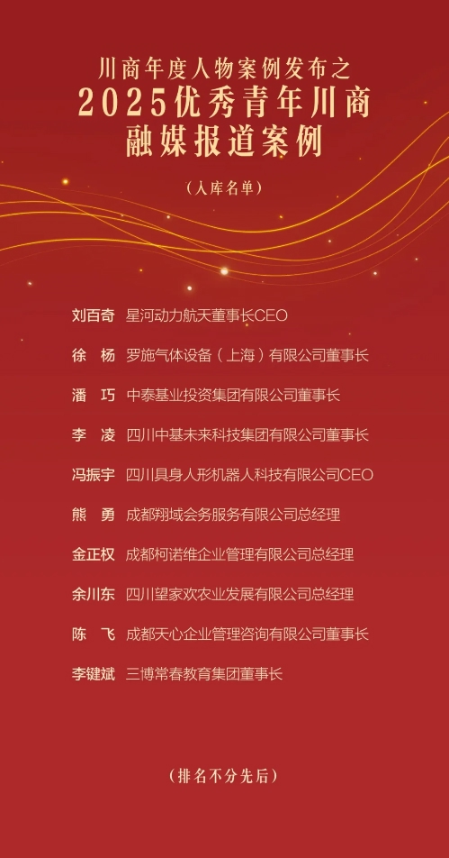 活动现场发布了“2025优秀青年川商融媒报道案例”入库名单。主办方介绍,该名单所囊括的产业,既涵盖了商业航天、机器人等前沿科技赛道,也有深耕农业、教育等传统领域,形成 “高精尖突破+实体经济扎根+现代服务业融合” 的立体发展格局。这些跨领域的实践不仅丰富了四川产业生态,更彰显了青年川商在技术创新与产业服务中的双重创造力,为区域经济高质量发展注入多元动能。