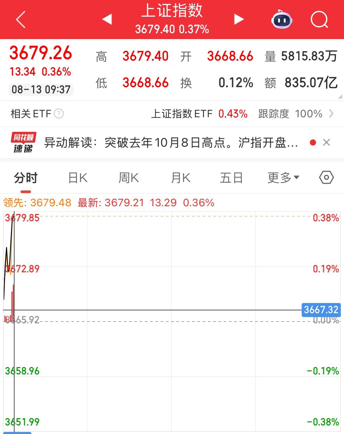 8月13日,沪指开盘两分钟后迅速突破关键阻力位,站上3675.26点,突破2024年10月8日的高点,也创下2021年12月17日以来的新高。9点34分沪指回落至3672.55点,再一鼓作气于9点37分站上3679.26点。此次指数突围得益于大金融板块的助推,以及科创板块的强势表现。
