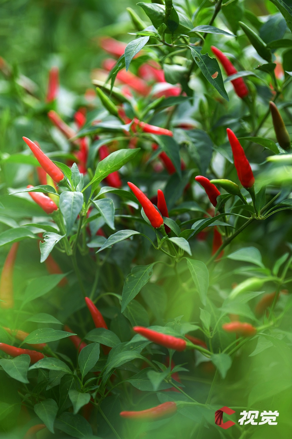 8月13日,在成都市金堂县官仓街道金蔬满仓农业科技有限公司的50亩菜地上,一垄垄辣椒苗枝条上结满一个个亮红色的小辣椒——中椒友G19辣椒。