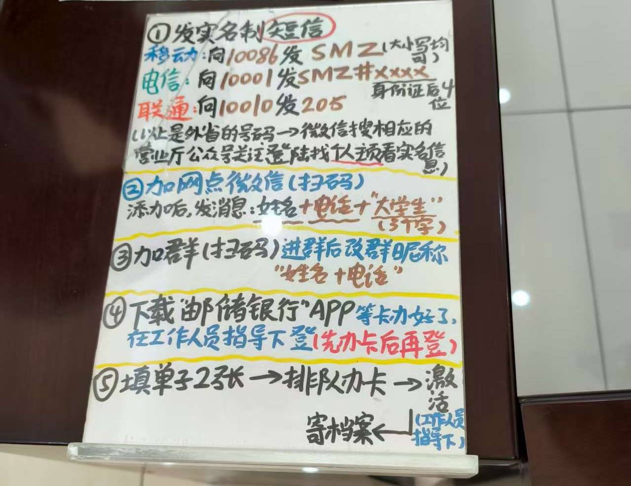 按照通知要求,刘同学来到泸县邮政局龙脑大道营业厅办理寄递档案手续。“工作人员一听到我是来寄递档案,就要求我按照一张手写图流程步骤来操作,并提前收掉我的身份证等着喊话。”刘同学说。他向记者展示了这张办理流程图照片,上面明确写着:“下载邮储银行APP”“填单子2张→排队办卡→激活→寄档案”等内容,刘同学说,按照这一系列流程走下来,加之当天办理业务人多,办完邮政银行卡已经花费一个多小时。