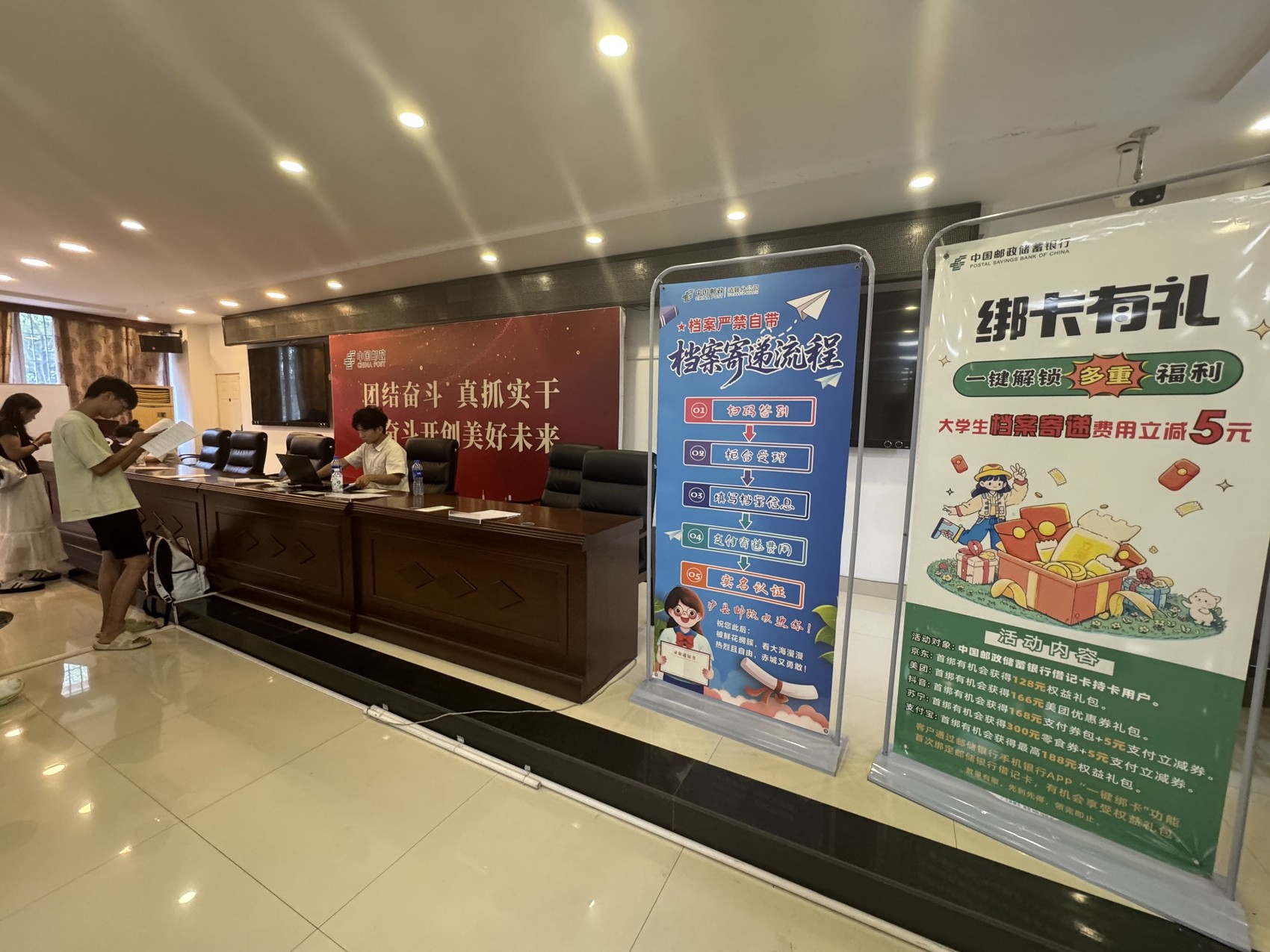 办理现场,立有“绑卡有礼”和档案寄递流程的宣传板