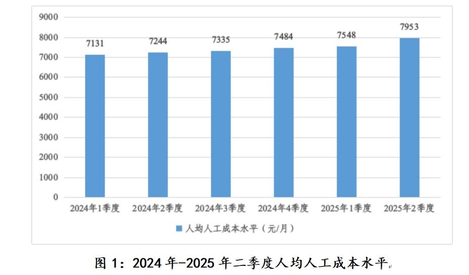 总体数据显示,四川省2025二季度制造业企业人均人工成本为7953元/月,同比增长9.79%,环比增长5.37%;人工成本占总成本比重为6.25%,同比下降0.46个百分点,环比下降2.13个百分点;人均劳动生产率为30731元/月,同比增长0.85%;人工成本利润率为123.51%,同比下降8.93个百分点;人事费用率为5.81%,同比下降0.31个百分点。