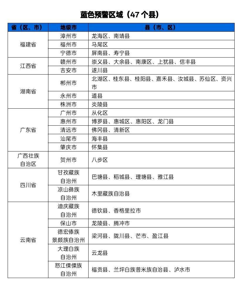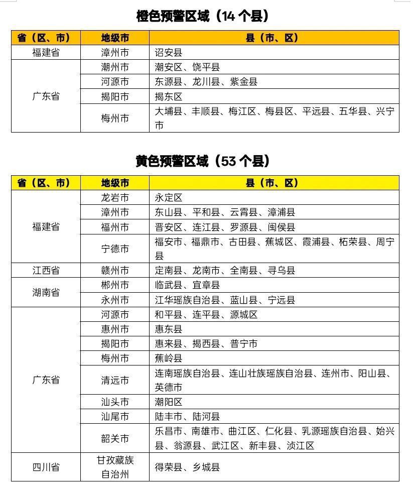预计,8月13日20时至8月14日20时,福建东北部和南部、江西南部、湖南南部、广东北部、四川西南部等地部分地区发生山洪灾害可能性较大(黄色预警),其中,福建南部、广东东北部局地发生山洪灾害可能性大(橙色预警),预警区域涉及的县(市、区)见下表。其他地区也可能因局地短历时强降水引发山洪灾害,请各地注意做好实时监测、防汛预警和转移避险等防范工作。