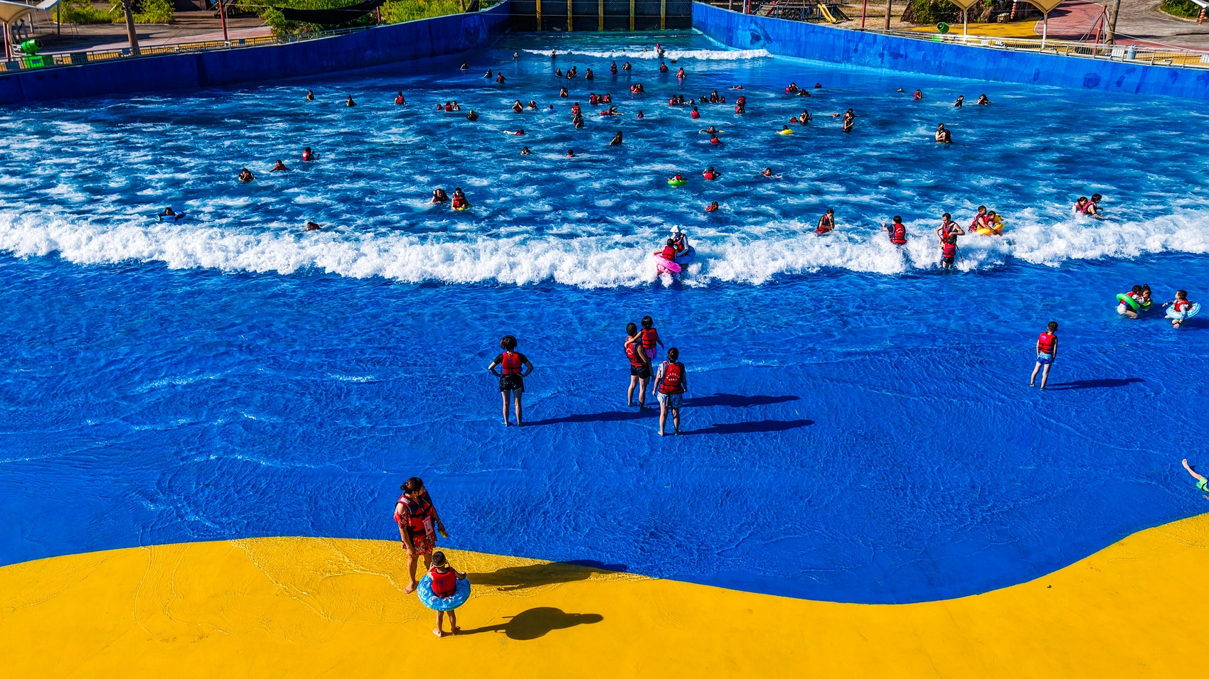 游客在平昌县驷马水乡大峡谷海啸池内冲浪戏水。张书浩 摄