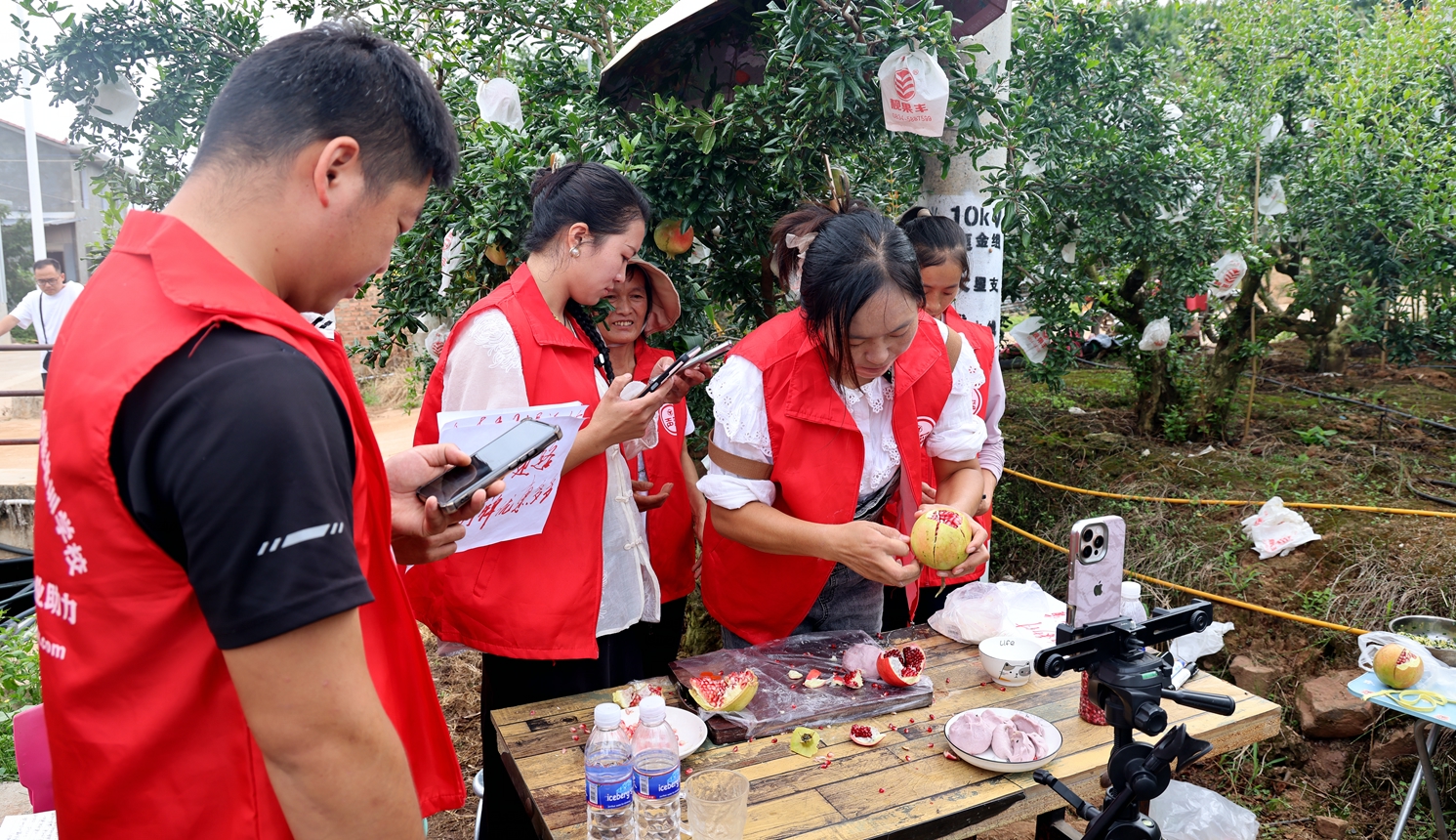 “世界石榴看中国,中国石榴看会理,我们今天就是在会理石榴的原产地……”“感谢大家的陪伴,我们下次再见,下次直播会给大家先发预告。”在石榴园,参加培训班的学员们正尝试直播。