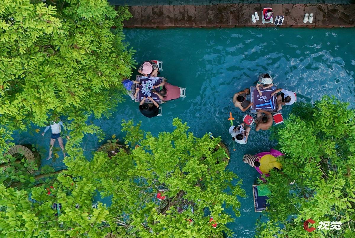 成都市双流区黄龙溪镇欢乐田园吸引众多市民前去消暑纳凉,不少人打起 “水上麻将”,乐享清凉时光。