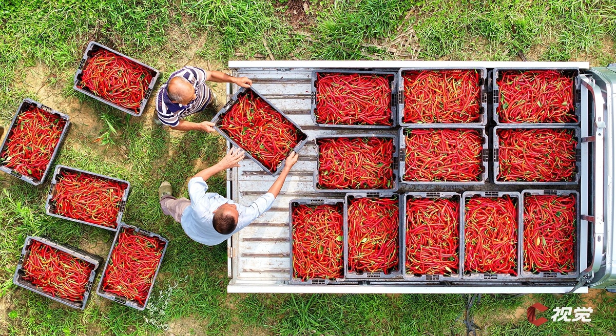 眉山市仁寿县禄加镇茶林村辣椒丰收,村民忙着装运刚采摘的辣椒。