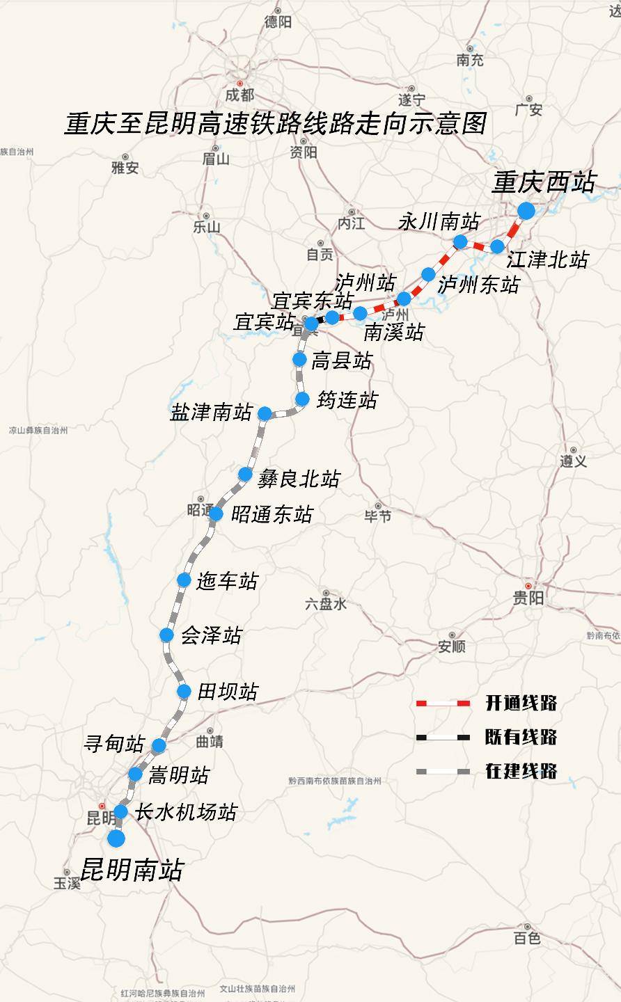 渝昆高铁是我国“八纵八横”高铁网京昆通道的重要组成部分。线路起自重庆西站,途经重庆市、四川省、贵州省和云南省,接入昆明南站,全长约700公里,设计时速350公里。