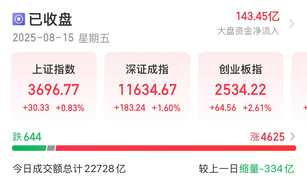 8月15日,A股三大指数集体收涨。截至收盘,沪指涨0.83%,收报3696.77点;深成指涨1.60%,收报11634.67点;创业板指涨2.61%,收报2534.22点。全市场全天成交额22728亿元,已连续三日交易额在2万亿元以上。全市场超4625只个股上涨,仅644只个股下跌。