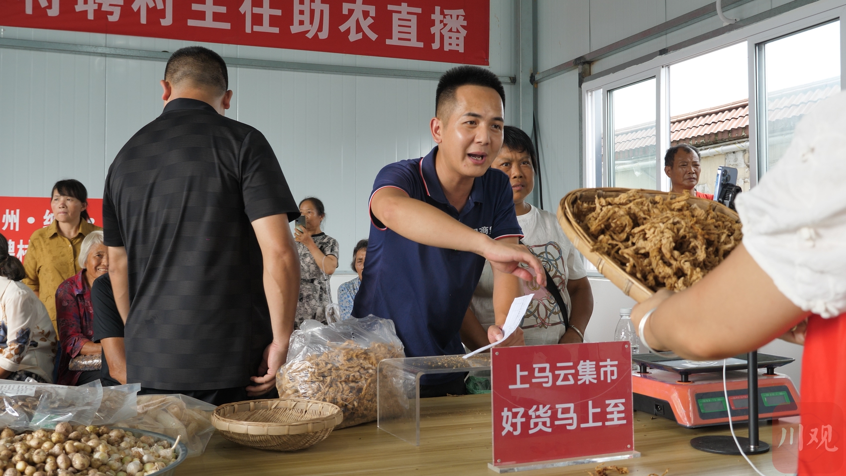 “本地农家大米,38.8元、9.5斤,包邮到家。”8月15日,在旧村小教室改造的直播间里,本土主播明洪强又开播了,当天卖的是上马镇刚出来的当年新米。旧村小楼顶,立有“上马镇农特产品集散交易中心”红色大字,一旁新建的仓库已成为收好货的集市,陆续有村民走进来售卖自家的农副产品。
