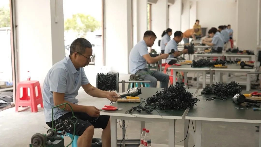 在南江县富民幸福工坊,村民们正在组装生产灯带产品。(受访单位供图)
