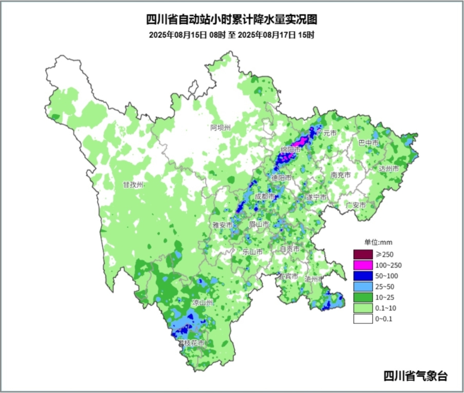 回顾刚刚过去的周末,四川盆地和攀西地区出现分散的暴雨或大暴雨,强降水主要集中在盆地西部的龙门山沿山,呈带状分布。据统计,8月15日8时至17日15时,全省有254个站点累计降雨量超过50毫米,其中39个站点超过100毫米。最大累计雨量出现在绵阳的江油市大康戴天山,接近199毫米;最大小时雨量出现在德阳的绵竹市富新玉石,为86.5毫米(15日22时)。