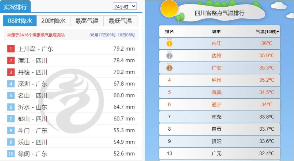但降水不耽误高温。从昨天白天到今天早上,四川有5个站点登上全国降水量排行榜TOP10;同时,四川盆地东部出现35~37℃高温天气。