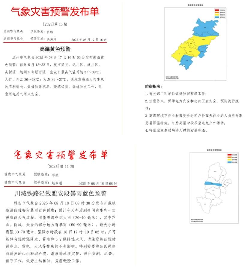 目前,达州市高温黄色预警、川藏铁路沿线雅安段暴雨蓝色预警生效中。