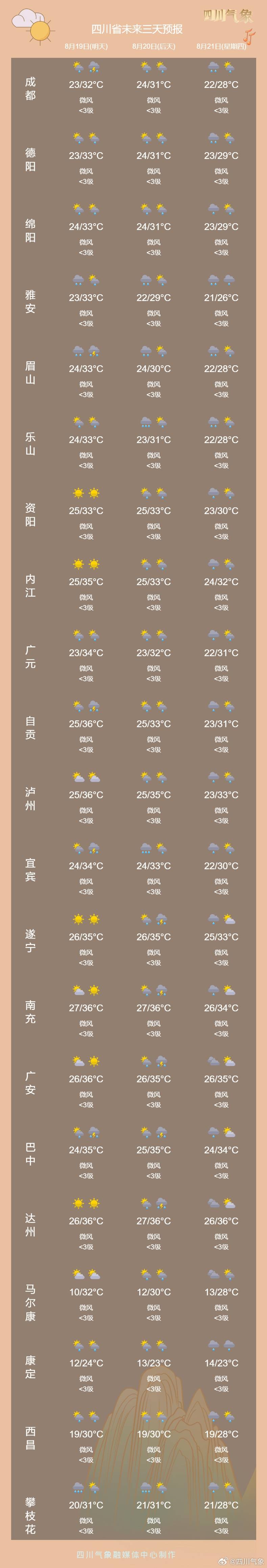 今天晚上到21日白天,盆地西部多阵雨或雷雨,部分地方有中雨到大雨,局部暴雨,盆地其余地方多云间晴;川西高原大部和攀西地区多雷雨或阵雨,局部地方有中雨到大雨,个别暴雨。