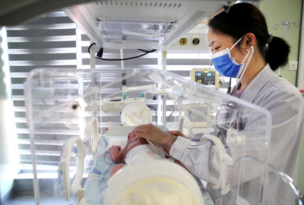 8月18日,在江苏省连云港市立东方医院新生儿科,医师给新生儿听诊。