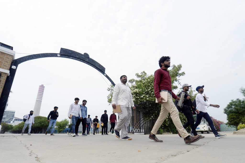 2024年7月29日,在巴基斯坦萨希瓦尔,暑期实习的学员走进华能巴基斯坦职业技术学院。新华社发(艾哈迈德·卡迈勒摄)