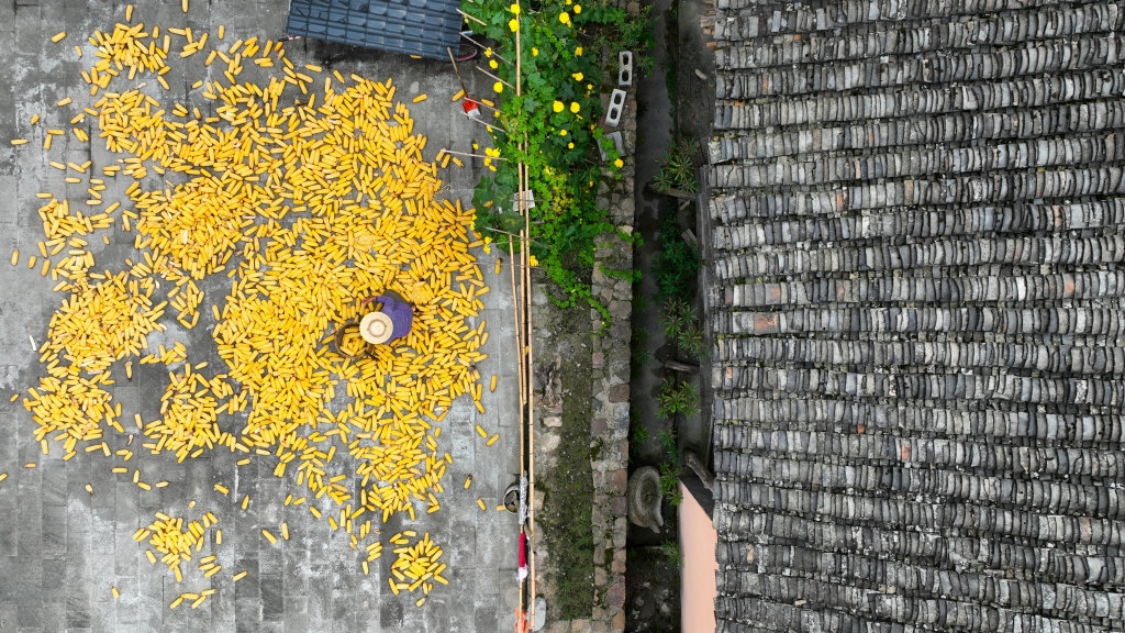 8月18日,猛董村村民在晾晒玉米(无人机照片)。