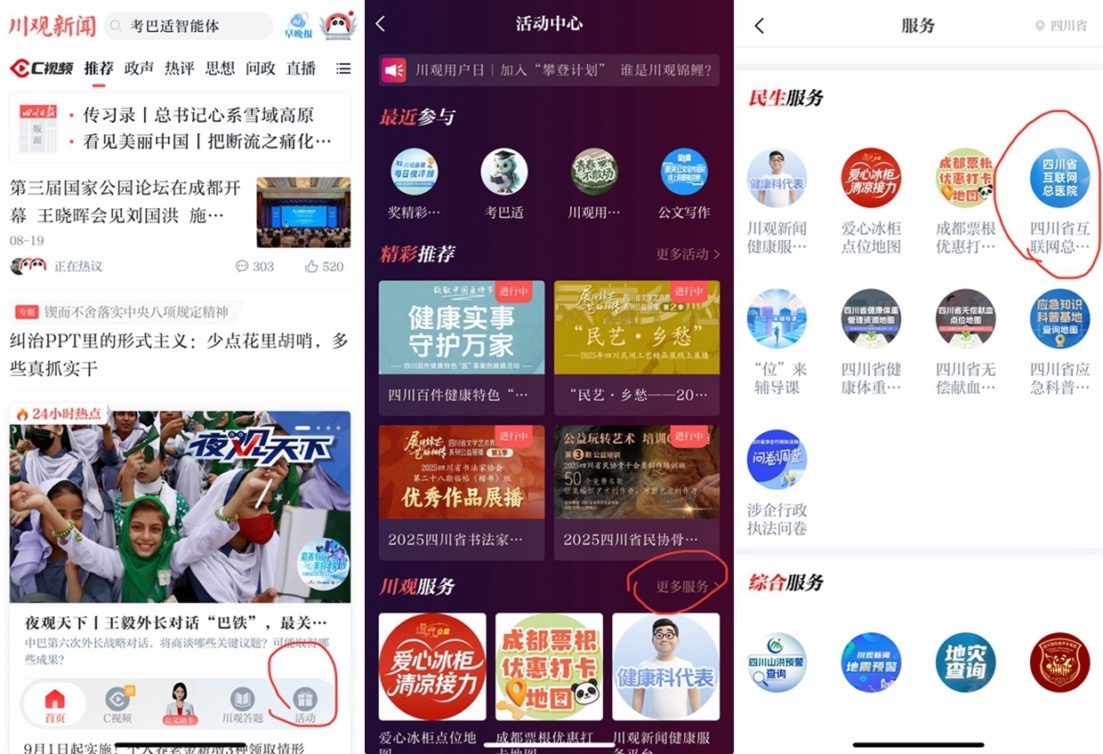3、访问川观新闻客户端点击“活动”-“更多服务”-“民生服务”也可访问四川省互联网总医院。