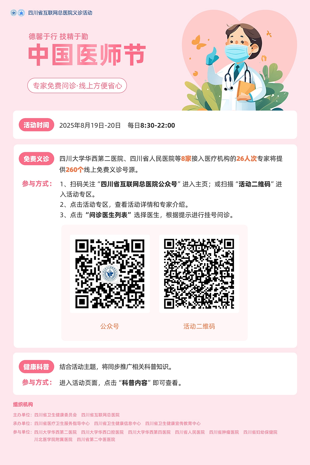 今天的8:30—22:00,四川省互联网总医院组织四川大学华西口腔医院、四川省人民医院等8家医疗机构的口腔、妇科、儿科、呼吸、消化、医疗美容等10余个专业的专家开展线上义诊。