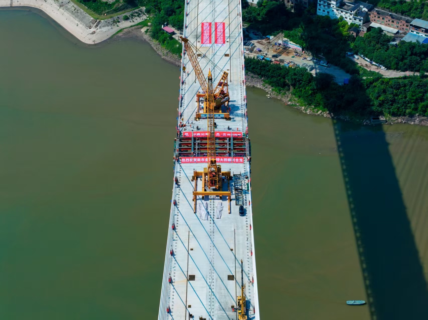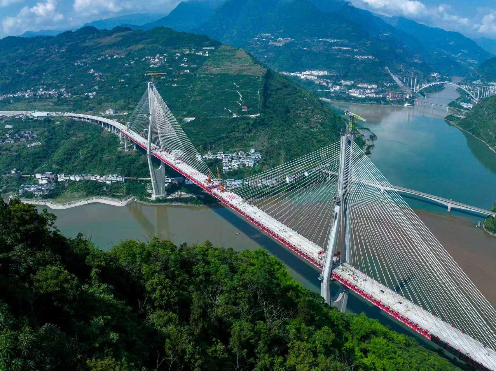 新市金沙江特大桥由蜀道集团川高公司投资、四川省公路院设计、四川路桥交建集团承建,连接四川屏山县新市镇与云南绥江县南岸镇,是川滇两省的重要交通纽带。大桥全长1867米,其中主桥长1288米,引桥长579米,为双塔双索面钢桁梁斜拉桥。大桥云南岸索塔高达297.51米,刷新了川滇两省索塔高度纪录,主跨达680米。