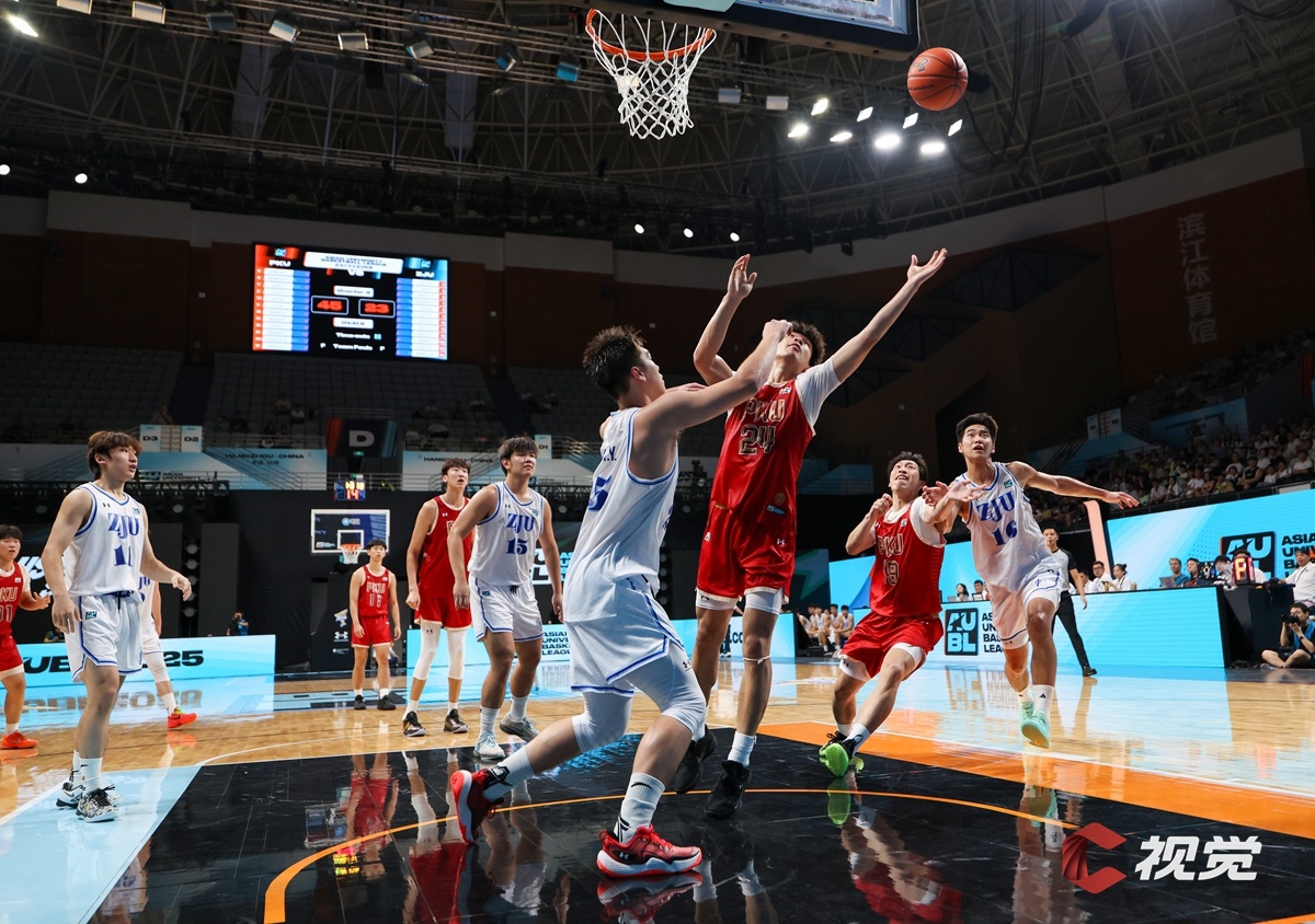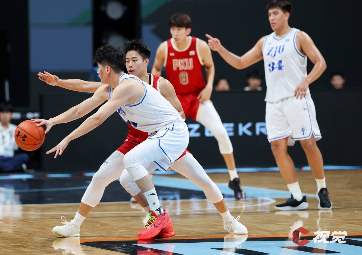 浙江大学队(白色球衣)与北京大学队(红色球衣)篮下争抢。
