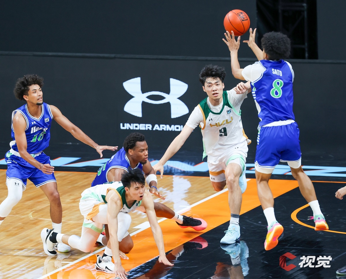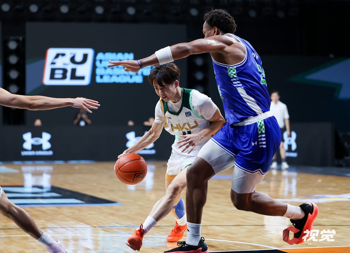 中国香港大学队(白色球衣)突破日本白鸥大学队(蓝色球衣)包夹。