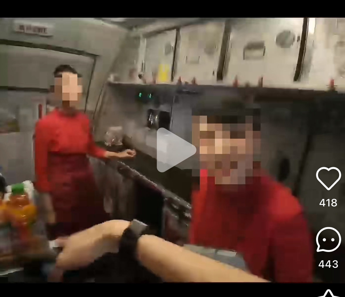 视频中,川航的乘务员正在客舱后舱厨房摆餐。一名男乘客走过来对乘务员说,“你先放着,你不用摆,我让乘务长过来摆。”