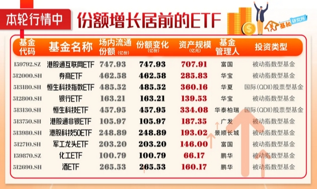 在本轮行情中,跟踪港股互联网、科技股、非银以及跟踪A股券商、军工、化工等指数的ETF份额增长最为明显,受到资金青睐。医药ETF场内流通份额却减少,显示资金有撤出迹象。