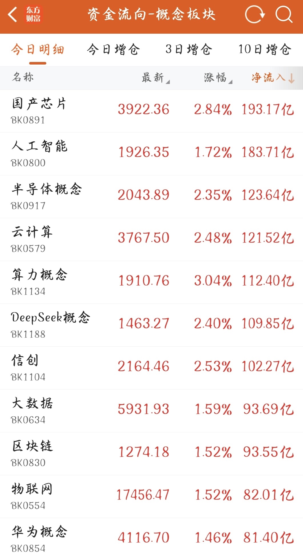 科技股成为全天“绝对主角”。最为亮眼的是国产芯片概念,单日净流入达193.17亿元,人工智能、半导体、云计算、算力概念、DeepSeek概念、信创等六大相关板块均获百亿元级资金追捧,七大赛道合计吸金超946亿元,接近千亿规模;大数据、区块链、物联网等泛科技板块表现活跃,资金净流入均逼近百亿元级别。