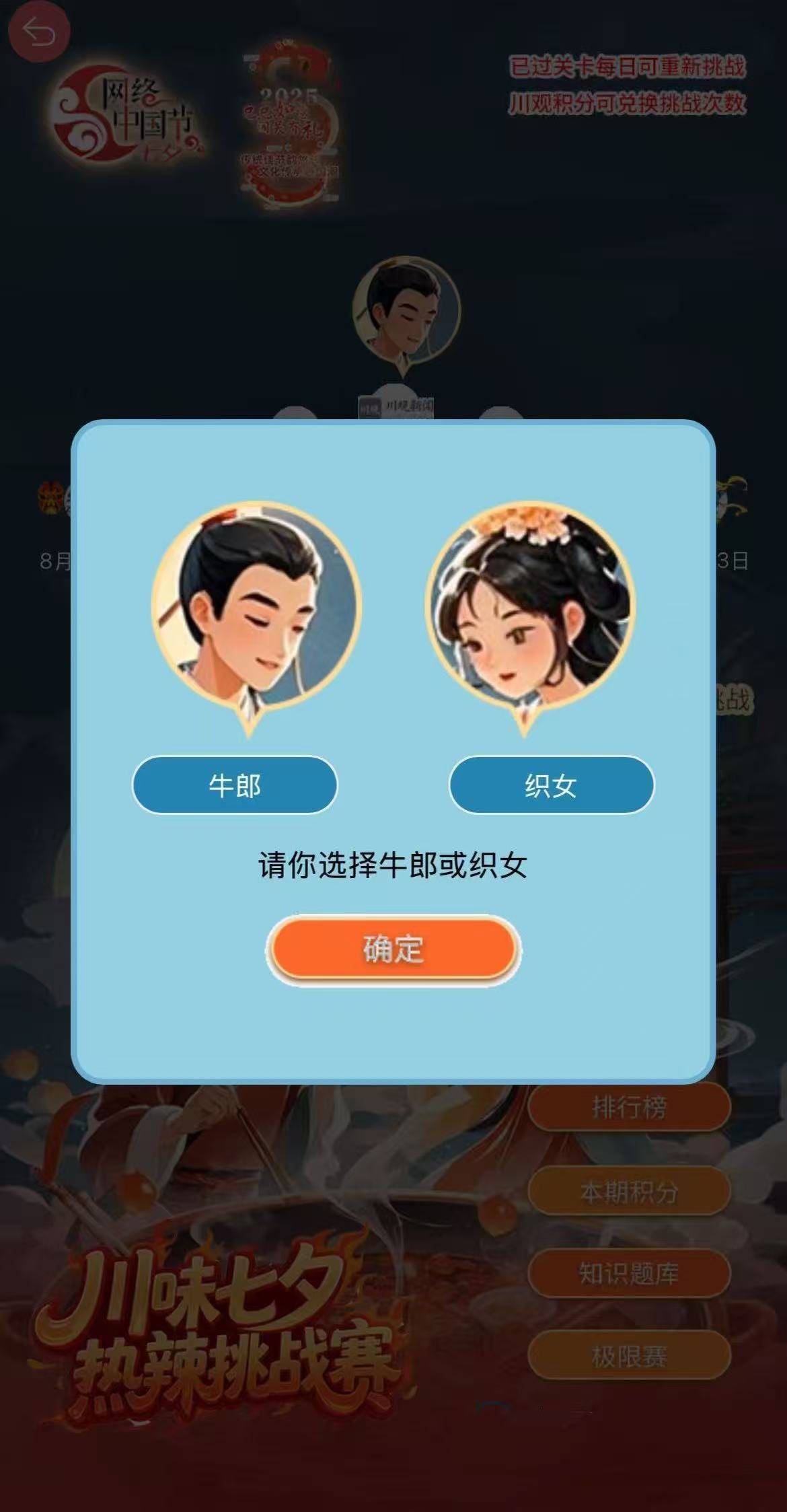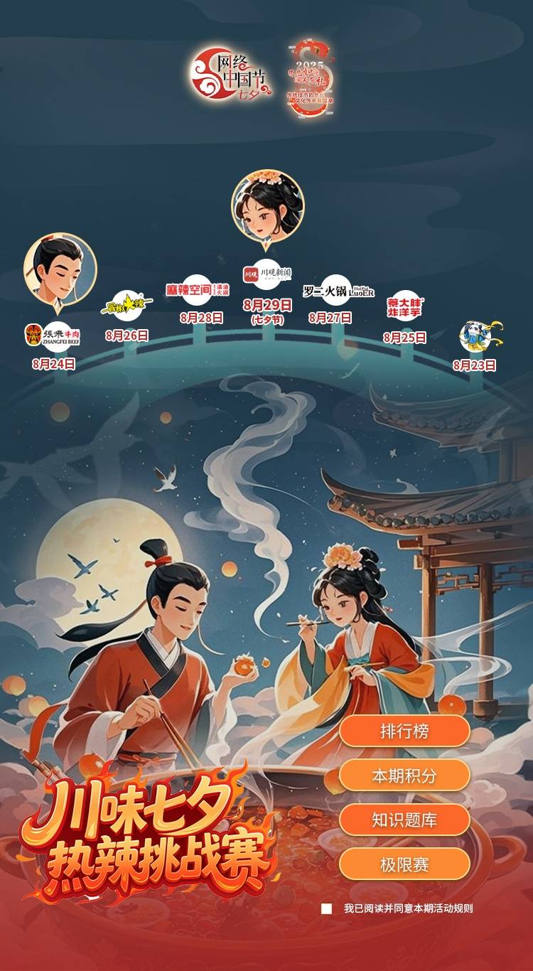 PS,本次“川味七夕热辣挑战赛”活动积分将按比例计入2025年“网络中国节”“巳巳如意 闯关有礼”活动总排行榜。重阳节活动结束后,总排行榜排位靠前的用户还将获得额外奖励。另,本次活动,所有用户皆可进入排行榜,包括前期活动中已获奖用户。
