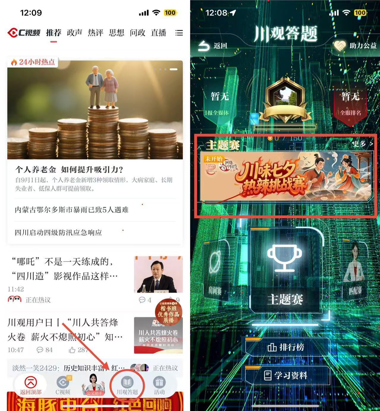 方式二:在川观新闻首页,点击下方“川观答题”,找到“川味七夕”活动图片,点击即可参与;