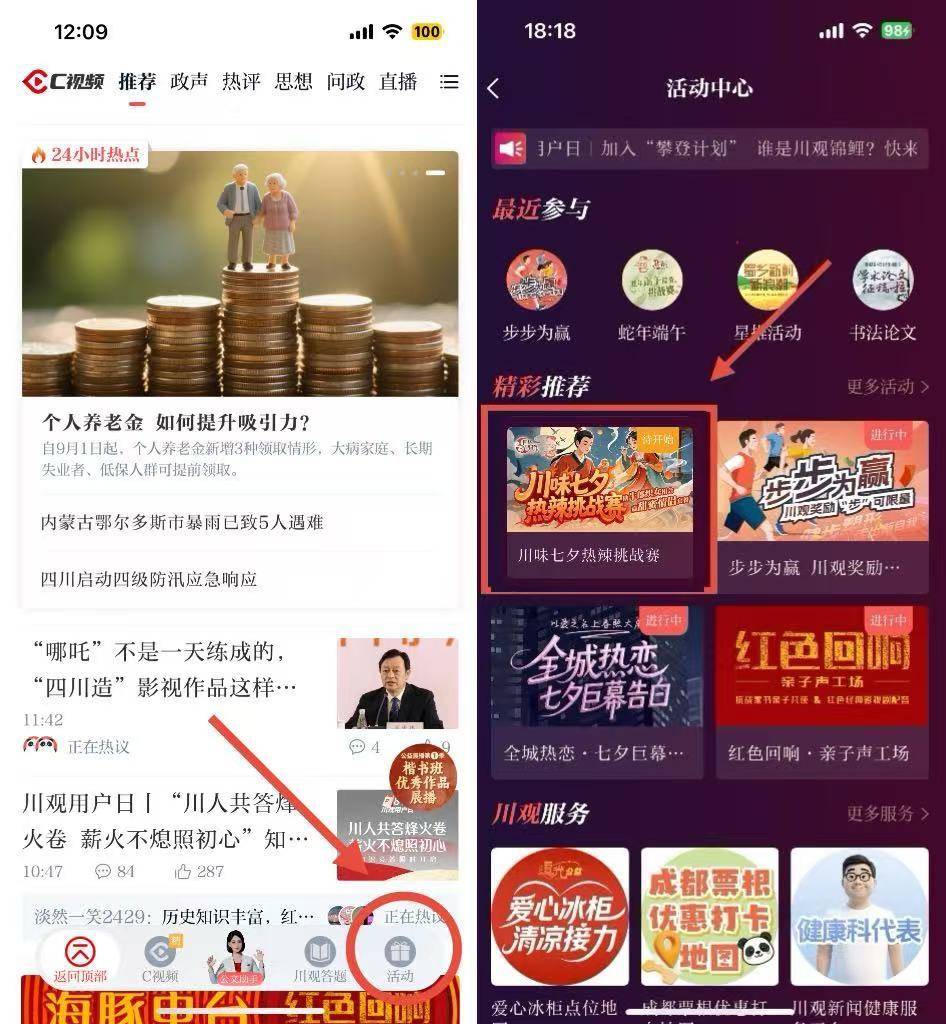 第二步:打开川观新闻客户端,您可以通过以下四种方式参与“川味七夕热辣挑战赛”活动: