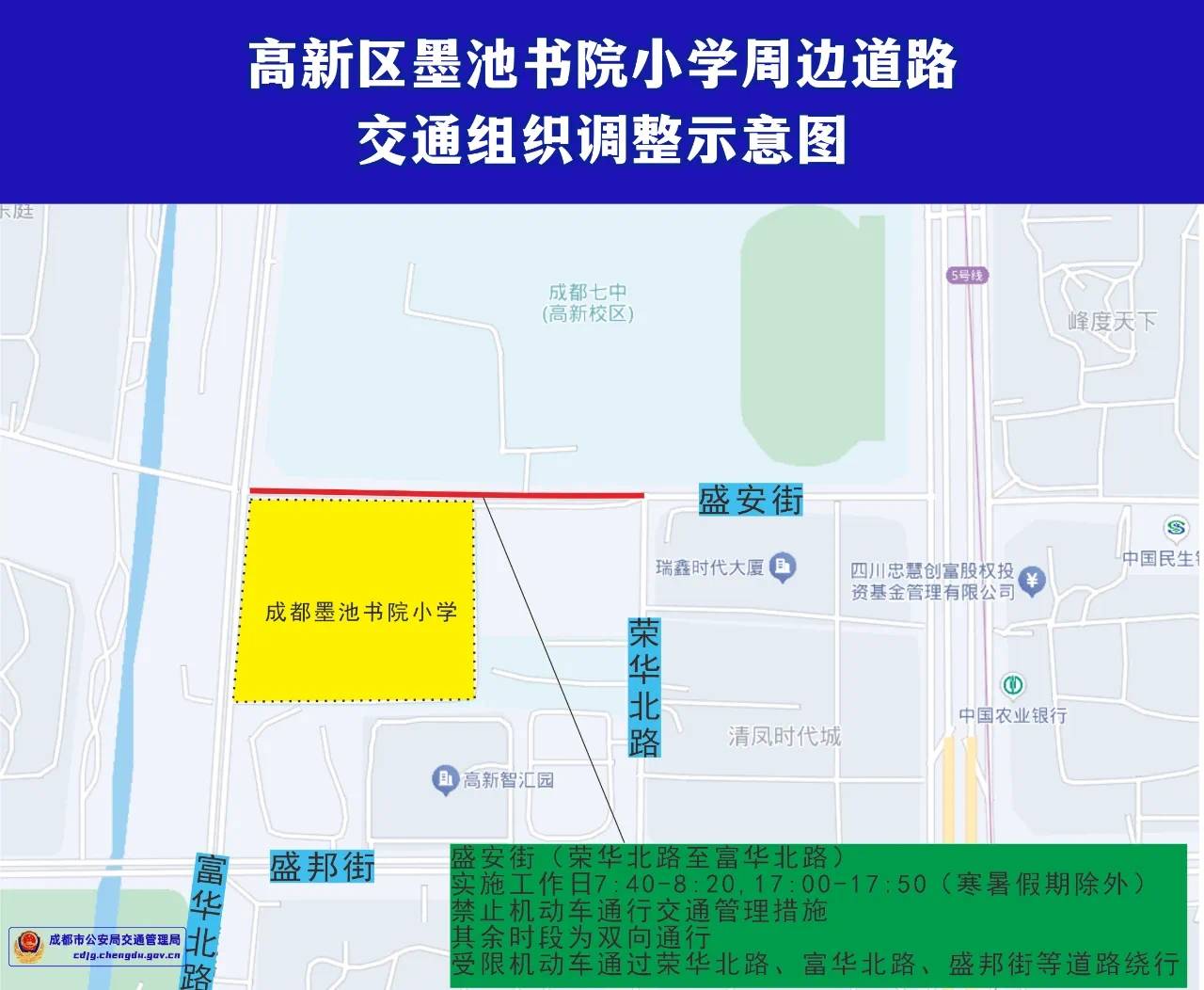 9月1日起,高新区墨池书院小学周边的盛安街(荣华北路至富华北路)实施工作日每天7:40至8:20、17:00至17:50(寒暑假期除外)禁止机动车通行交通管理措施,其余时段为双向通行,受限机动车通过荣华北路、富华北路、盛邦街等道路绕行。