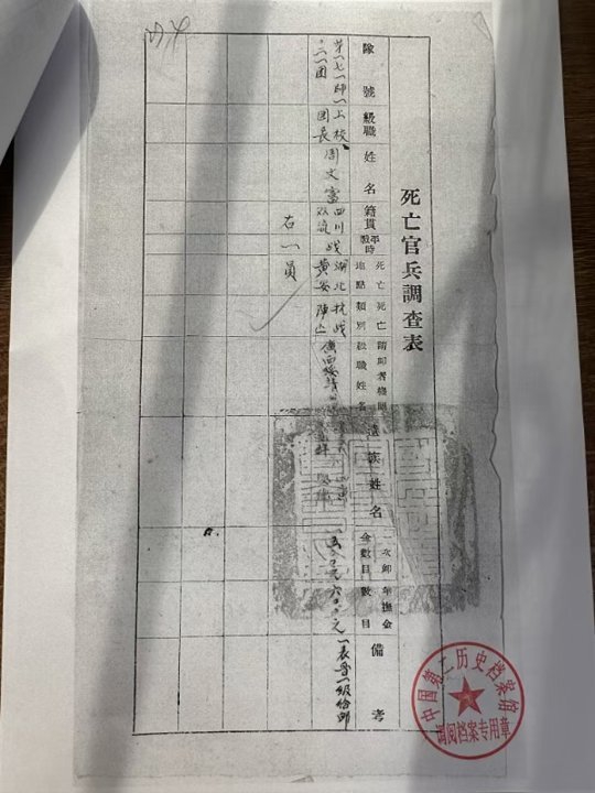 死亡官兵调查表记载着周文富为171师1021团团长,籍贯为四川双流,于湖北黄安抗战阵亡(中国第二历史档案馆 供图)