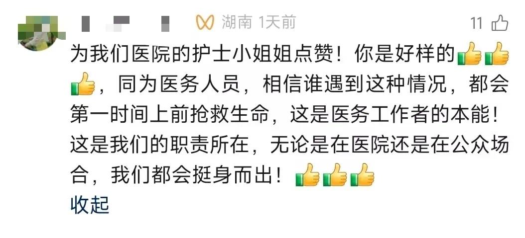 事后,成琳在成都东站救人的善举引发众多网友关注和点赞。四川网友留言称“成都人民感谢湖南护士的施救,好人一生平安!”,湖南网友自豪表示“医务人员不管何时何地都会救死扶伤!”
