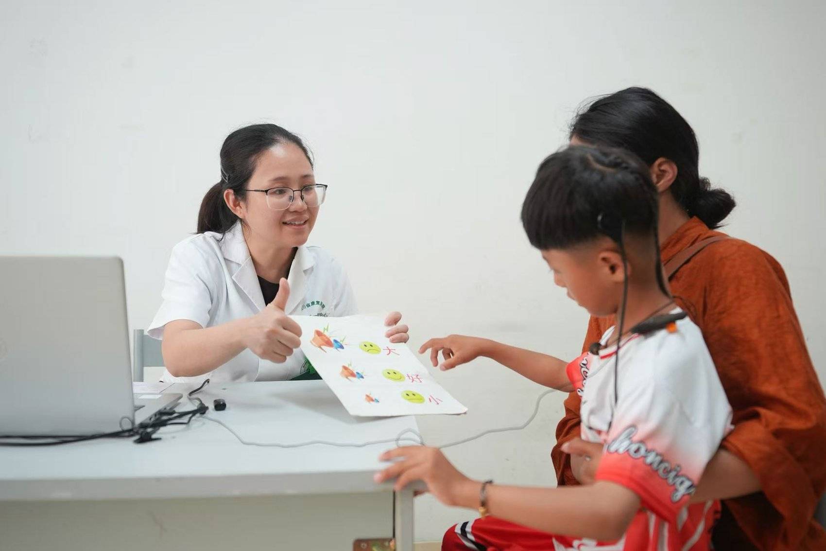 四川省八一康复中心(四川省康复医院)医生正在为佩戴人工耳蜗的孩子进行康复训练