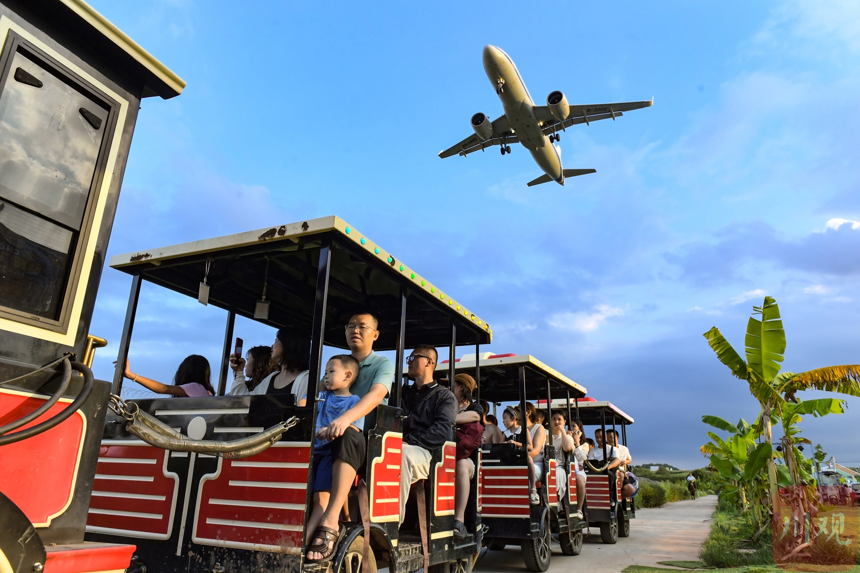 游客在成都市双流区梦幻植物迷宫主题公园坐小火车休闲,与一架正在降落的飞机“同框”。